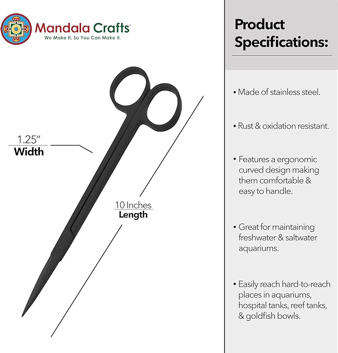Mandala Crafts 10 Inches Black Stainless Steel Straight Aquarium Scissors for Trimming Aquatic Plants – Long Aquascape Scissors for Fish Tanks, Hospital Tanks, Goldfish Bowls, and Terrariums