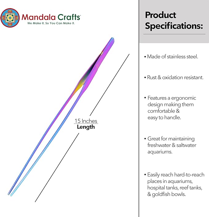 Mandala Crafts 15 Inches Rainbow Stainless Steel Straight Aquarium Tweezers for Aquatic Plants – Long Aquascape Forceps for Fish Tanks, Hospital Tanks, Goldfish Bowls, and Terrariums