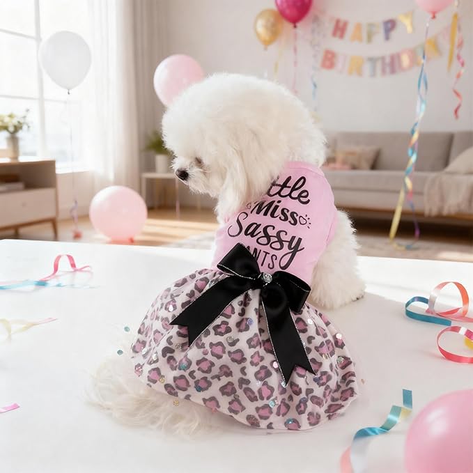 Little Miss Sassy Pants Dog Dress with Leopard Print Bowknot Dog Clothes for Small Medium Large Dogs Girls Boys Cats Outfit Apparel
