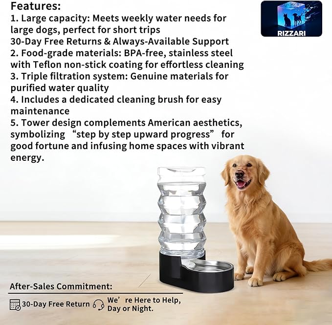 RIZZARI Large Dog Water Dispenser: Stainless Steel Pet Water Bowl - 9L Black Stainless Steel Automatic Pet Gravity Feeder with Filter Indoor/Outdoor