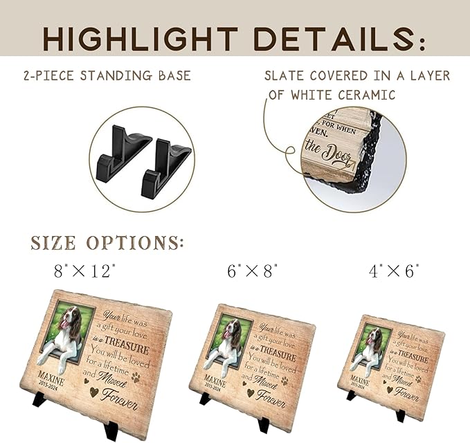 - Size and Base: Four sizes are available to suit your needs. This memorial stone comes with a double-layered base, making it ideal for placement on bookshelves, fireplaces, gardens, backyards, or bedside tables. These customized gifts turn into a meaningful and heartfelt pet loss sympathy gift dog