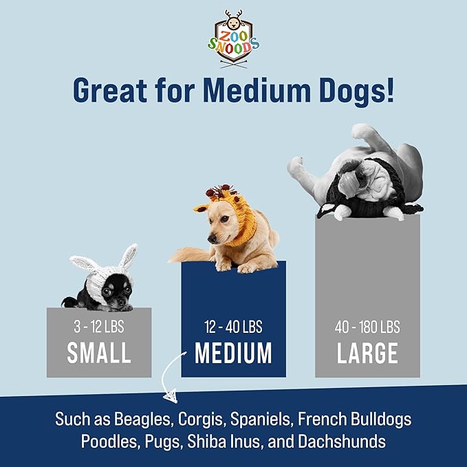 - For our Medium size snood, we recommend dogs weigh between 15-60 lbs and head circumference is between 12-18 inches. The length of the costume in this size is approximately 7 inches