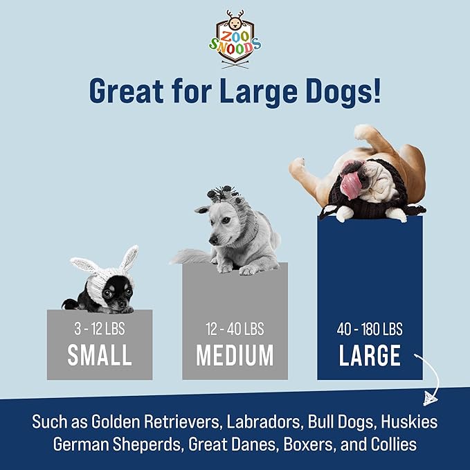- For our Large size snood, we recommend dogs weigh between 60-180 lbs and head circumference is between 18-26 inches. The length of the costume in this size is approximately 10 inches