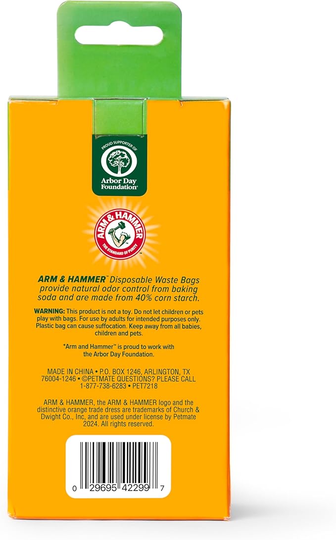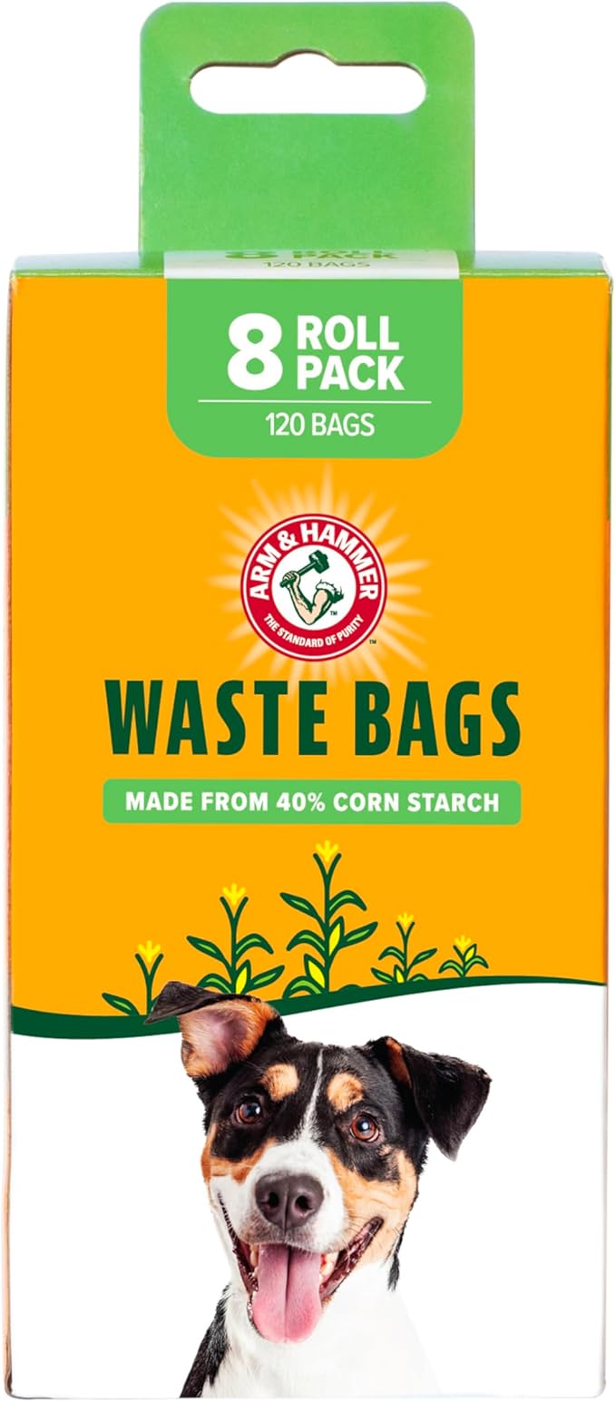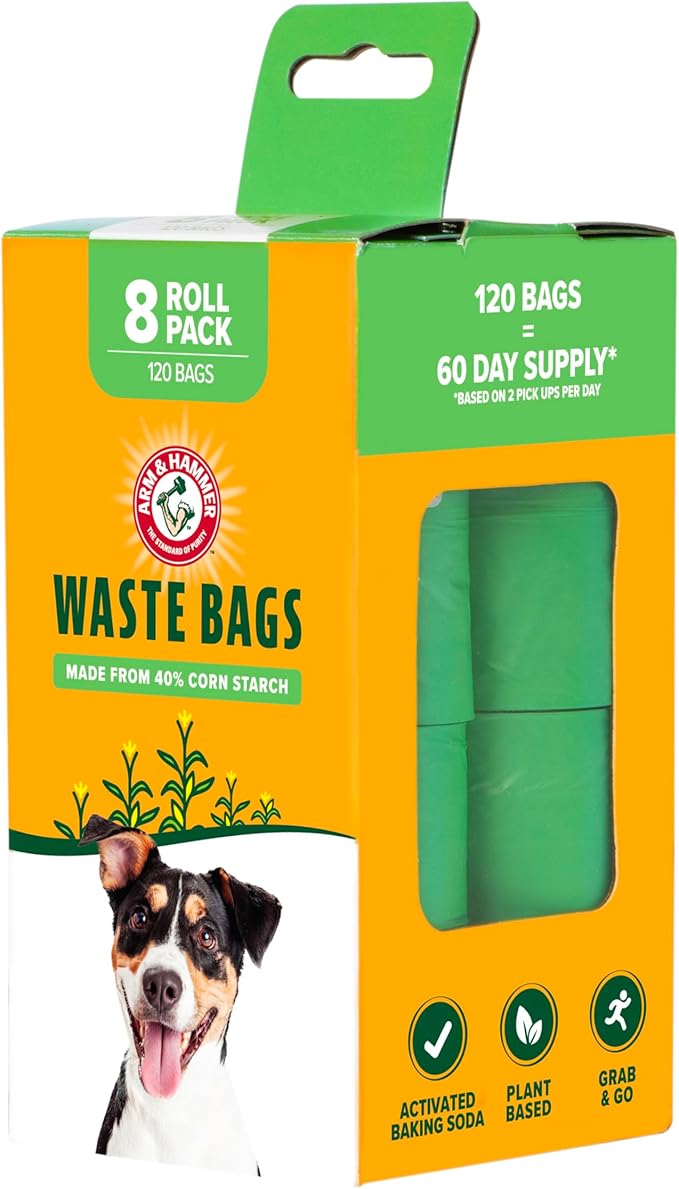 Arm & Hammer Dog Poop Leakproof Plant Based 120 Count Waste Bags, Unscented, Made From 40% Corn Starch With Activated Baking Soda, Pack of 8, Green