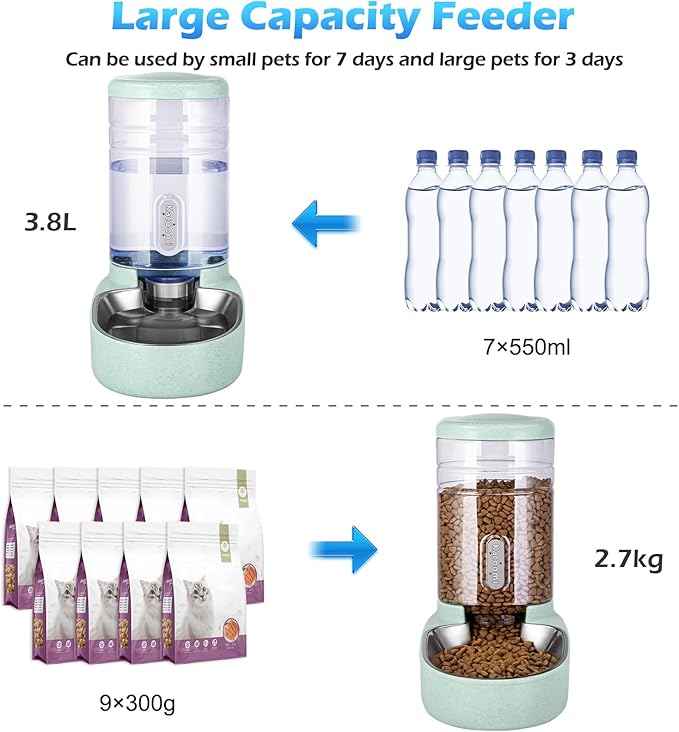 Automatic Cat Feeder and Water Dispenser with Stainless Steel Bowl Gravity Food Feeder and Waterer Set for Small Medium Dog Puppy Kitten 1 Gallon x 2(Green)