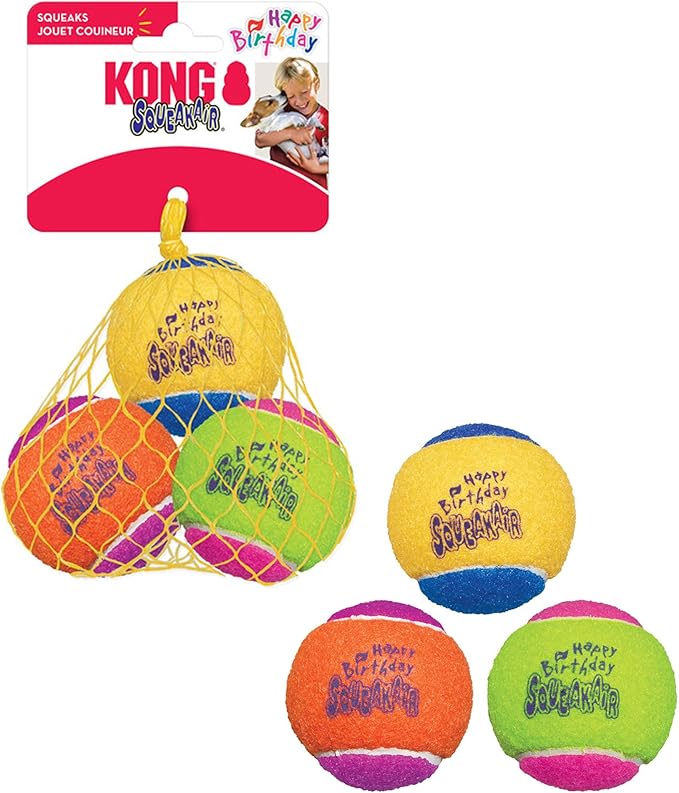 About This Durable & Safe Design: The KONG SqueakAir Birthday Tennis Balls combine a strong tennis ball exterior with a... Read more