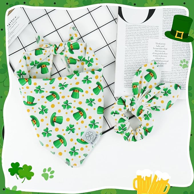 E-Clover St Patricks Day Dog Bandana & Matching Scrunchie Set Cute Girl Dog Scarf Bibs Pet Bandanas with Bow Tie for Small Dogs Puppy Owner Mom Green