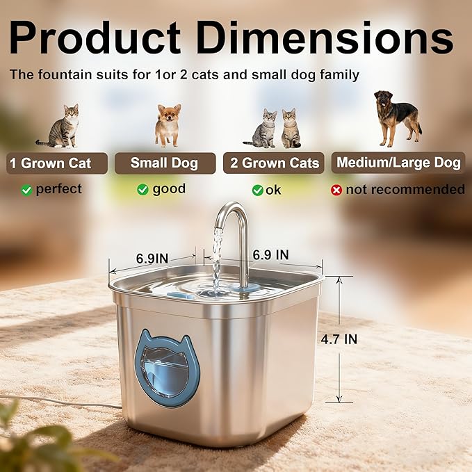 Luxury Automatic Cat Water Fountain for Pets, 2.2L/74oz Stainless Steel Dog Water Dispenser with Filter, BPA Free & Silent, Featuring LED Light, Easy Clean & Cat View Window
