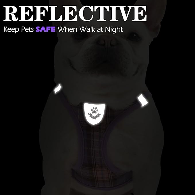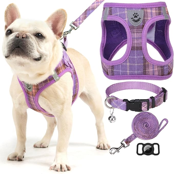 EXPAWLORER Classic Plaid Puppy Harness - Small Dog Harness and Leash Set - Dog Collar and Leash Set with AirTag Holder, Soft Padded Step in Dog Vest Harness No Pull Reflective for Outdoor, Purple XXS