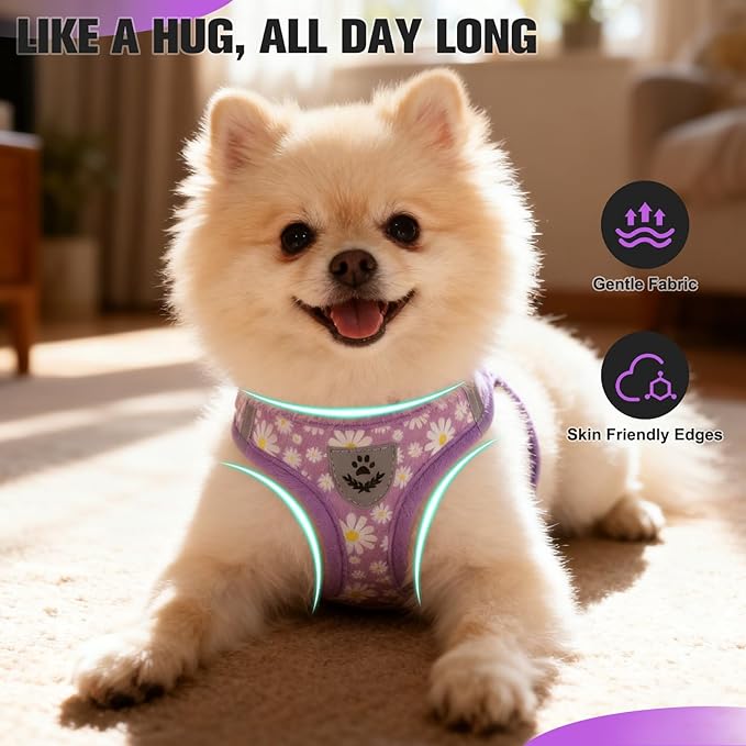 EXPAWLORER Small Dog Harness and Leash Set - Cute Spring Puppy Harness Leash Dog Collar with AirTag Holder Silicone Case, Soft Padded Step in Pet Vest Reflective for Outdoor Walking, Purple Daisy S