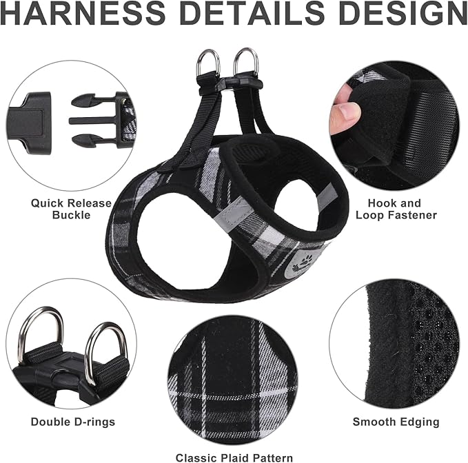 EXPAWLORER Classic Plaid Puppy Harness - Dog Collar and Leash - Soft Mesh Padded Adjustable Step in Small Dog Vest Harness No Pull, Reflective Escape Proof for Outdoor Walking, Black L