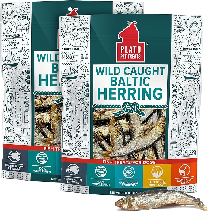 Plato Pet Treats Fish Dog Treats - Air-Dried, Single Ingredient Pet Treat - Omega 3 & 6 Fatty Acids to Support Skin and Coat - 100% Whole Fish - Wild Caught Baltic Herring - 8.5 oz - 2 Pack