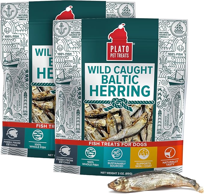 Plato Pet Treats Fish Dog Treats - Air-Dried, Single Ingredient Pet Treat - Omega 3 & 6 Fatty Acids to Support Skin and Coat - 100% Whole Fish - Wild Caught Baltic Herring - 3oz - 2 Pack